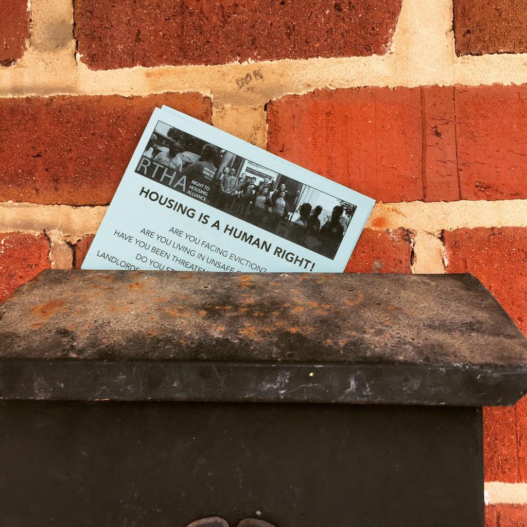 Lewis told volunteers that many of these homes may turn out to be abandoned, and indeed many addresses that volunteers visited appeared to be vacant properties. Volunteers took notes after each visit, documenting, among other things, the building type, whether or not they had a conversation with a tenant, and whether the property looked occupied or vacant. Volunteers left blue RTHA flyers outside most of the doors they visited that listed information on how to get support and more involved in organizing.